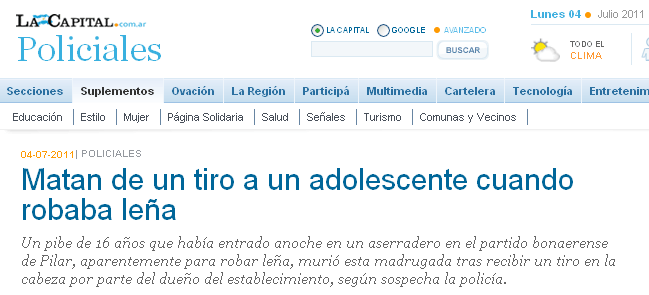 ¡Qué raro! El muerto no tiene nombre, el asesino tampoco. Lo primero no debe ser porque el occiso sea menor de edad, ya que una vez muerto, uno no es ni joven ni viejo, es eterno, asi que por ahí no es la cosa. Lo segundo, seguramente, es para proteger la integridad del matador no profesional. El tipo quería resguardar su leña para el crudo invierno que arrecia su comarca, y tuvo, muy a su pesar, que gastar una bala para detener el atraco.